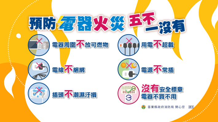 5不:用電不超過負載、電線不綑綁折損、插頭不潮濕污損、電源插座不常插、電器旁不放物品。