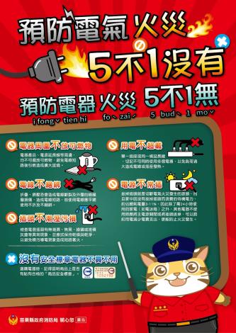 5不:用電不超過負載、電線不綑綁折損、插頭不潮濕污損、電源插座不常插、電器旁不放物品。