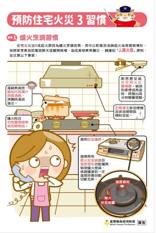 1、請謹記人離火熄觀念:於廚房烹煮時,應隨時注意爐火使用情形,人若要離開,應確認爐火是否已關閉。
