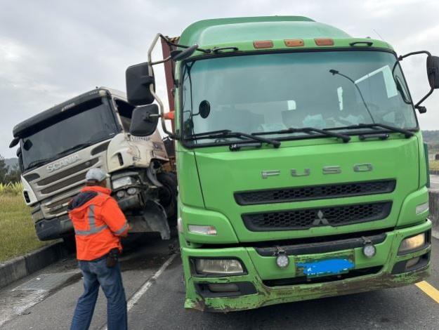 通霄消防分隊今日午間接獲中心通報轄內西濱連絡道閘道口發生一起車禍,該案件係由手機自動報案,因此現場狀況不明,通霄分隊立即派遣救護車前往現場,現場發現為聯結車與大貨車發生碰撞,所幸無人夾困車內,患者均意識清楚,僅有小擦傷,通霄分隊救護人員立即給予包紮止血後送至醫院進行救治。