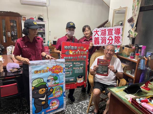 為強化民眾防火防災意識,大湖分隊於8月3日前往轄內靜湖村,辦理住宅用火災警報器(住警器)宣導活動,並結合瓦斯使用安全及日常用火用電注意事項進行全方位宣導。