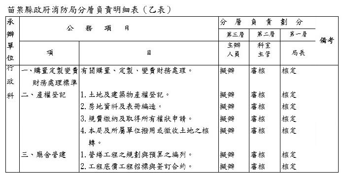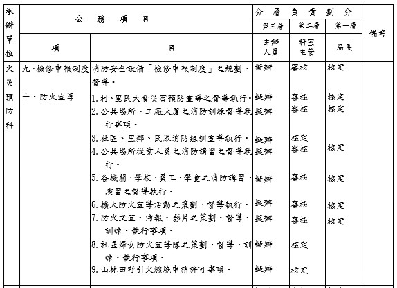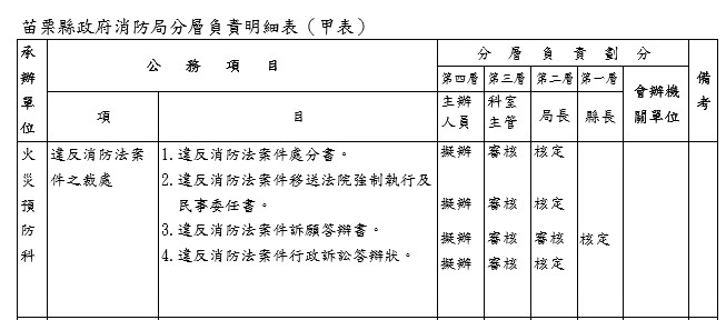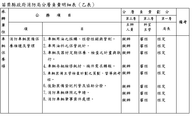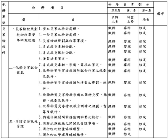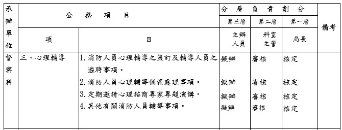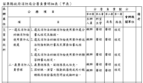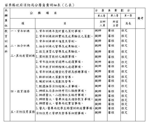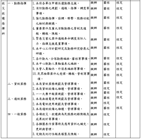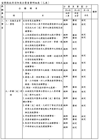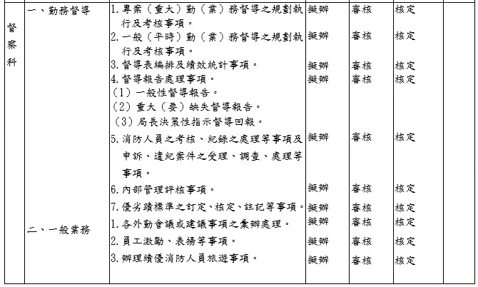 1.消防勤、業務督導。 2.督察綜合業務。 3.督察法令宣導。 4.義消及民間團體業務。 5.其他有關督察事項。 037-558119請按1613