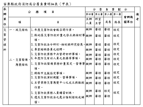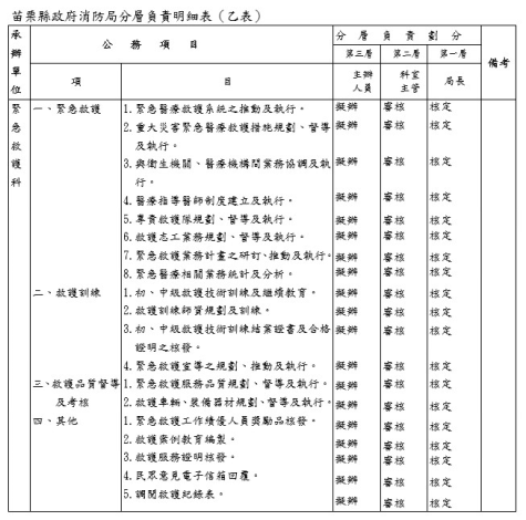 1、各鄉鎮市地區災害防救會報督導考核事項 2、地區災害防救計畫修正與檢討事項 3、強化災害防救體系相關事項 4、天然災害防災宣導與教育訓練事項 5、協調協力機構之研究計畫設計及執行事項 6、災害防救科技之應用及系統建置事項 7、災害應變中心運作及緊急動員作業 8、防災資料庫之調查及督導管理 9、重大災害緊急應變措施之規劃、檢討及檢討事項 10、主管災害之統計陳報 037-558119請按1315