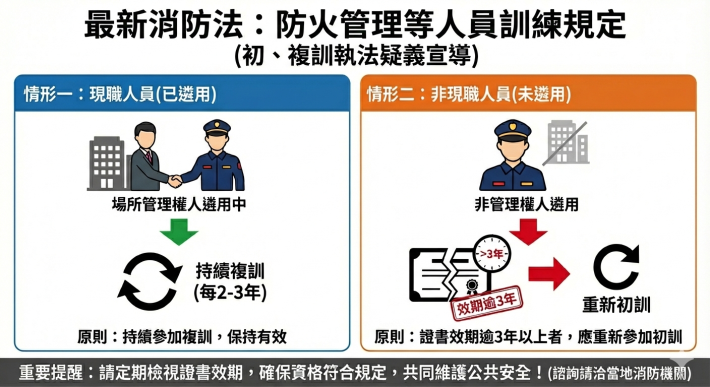 1.為場所管理權人遴用之防火管理人等,以持續參加複訓為原則。