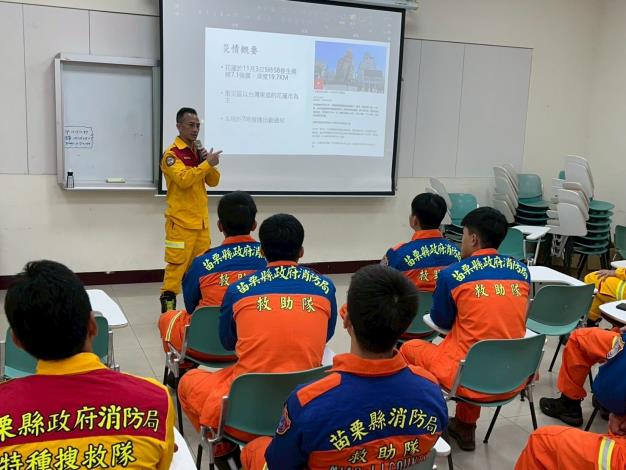 ⊙工廠(科技廠房)、高樓建築火災支援勤務。 ⊙水域事故救溺及特殊山域(苗栗縣聖陵線)事故搜救勤務。 ⊙地震災害及支援他縣市震災人命救援。 ⊙各類災害搶救之特殊災害演習。 ⊙重大交通事故重型救援勤務。